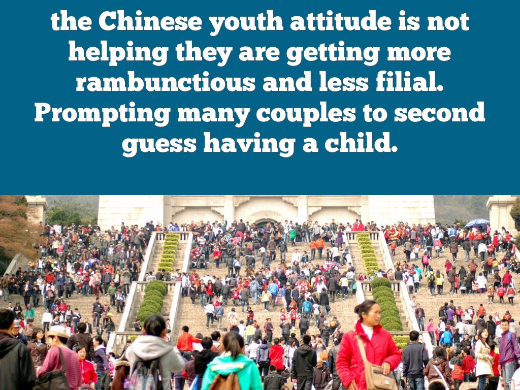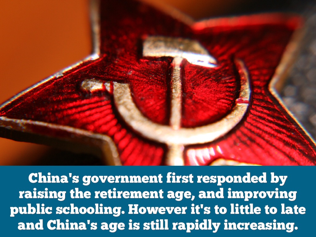 China's government first responded by raising the retirement age, and improving public schooling. However it's to little to late and China's age is still rapidly increasing.