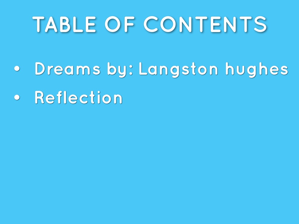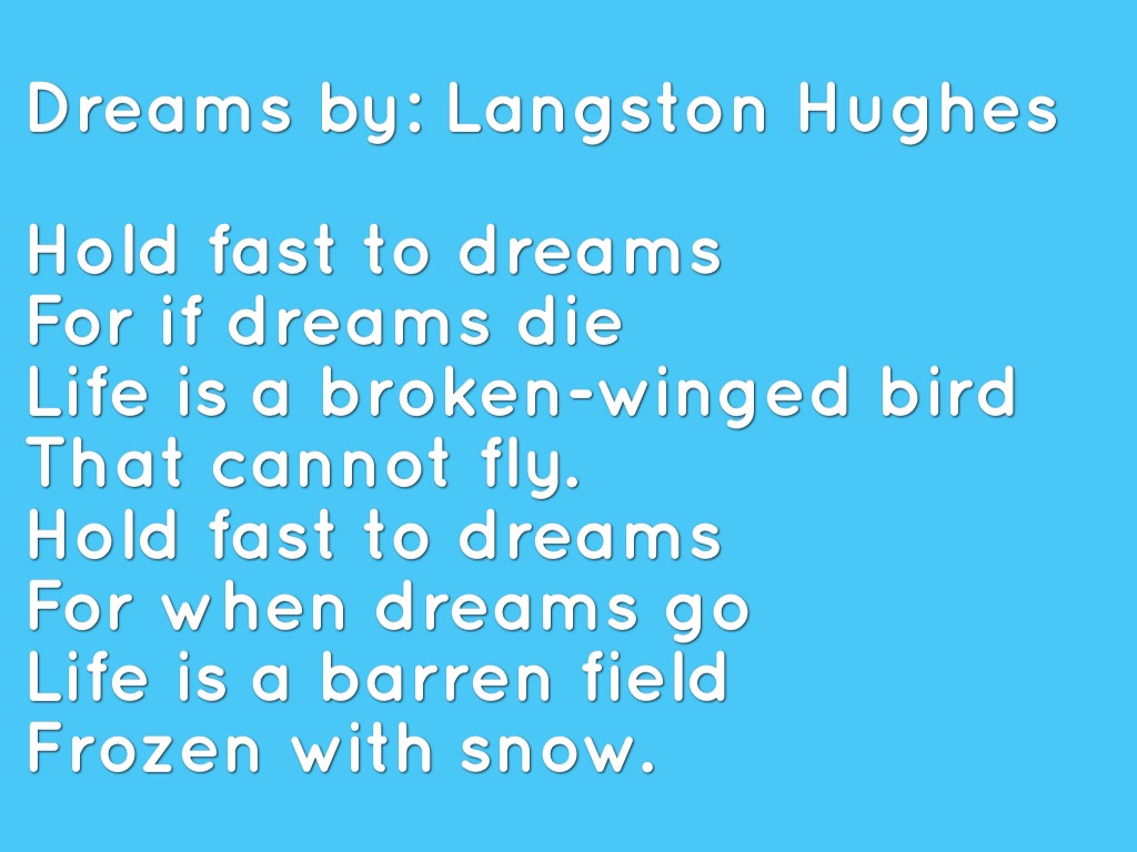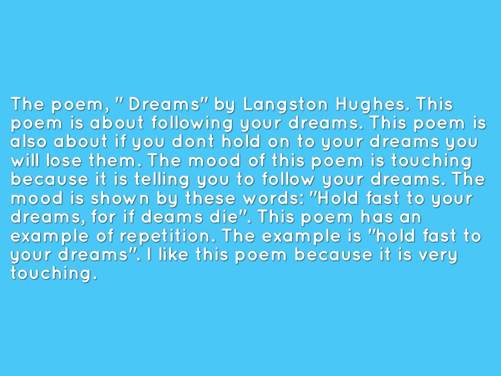 The poem, " Dreams" by Langston Hughes. This poem is about following your dreams. This poem is also about if you dont hold on to your dreams you will lose them. The mood of this poem is touching because it is telling you to follow your dreams. The mood is shown by these words: "Hold fast to your dreams, for if deams die". This poem has an example of repetition. The example is "hold fast to your dreams". I like this poem because it is very touching.