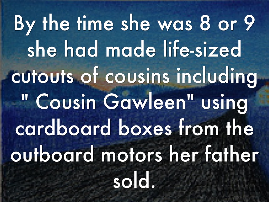 By the time she was 8 or 9 she had made life-sized cutouts of cousins including " Cousin Gawleen" using cardboard boxes from the outboard motors her father sold.