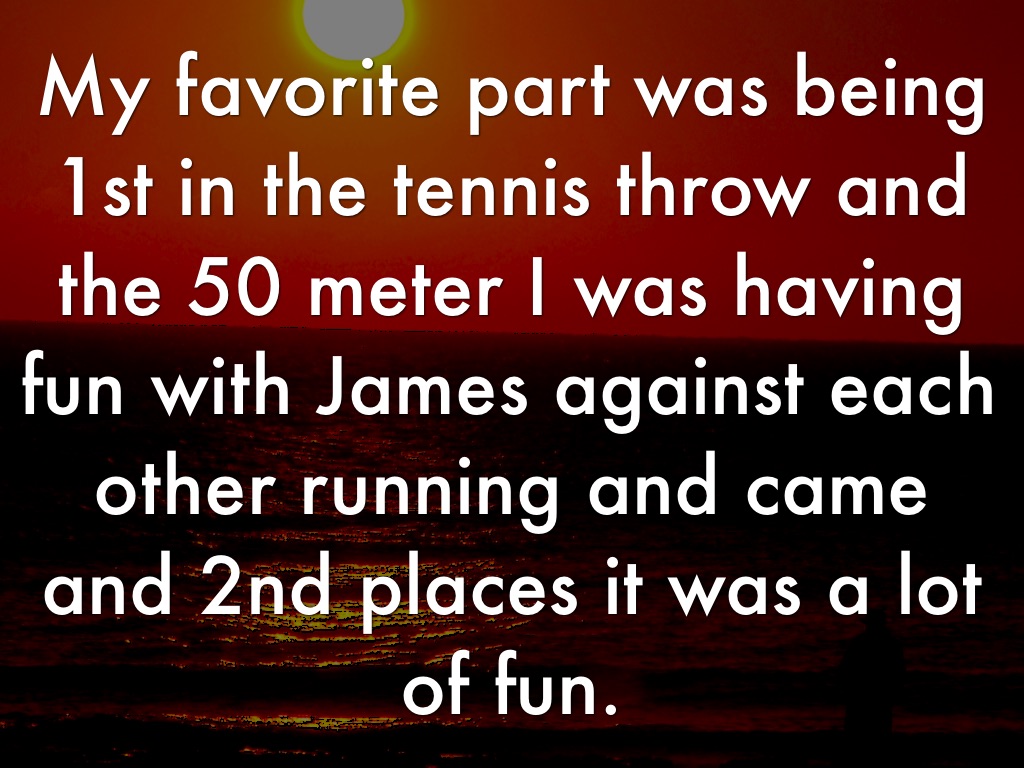 My favorite part was being 1st in the tennis throw and the 50 meter I was having fun with James against each other running and came and 2nd places it was a lot of fun.