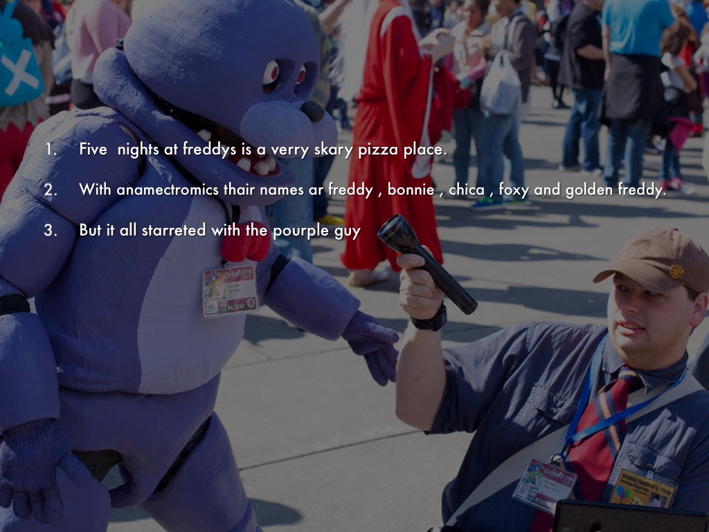 With anamectromics thair names ar freddy , bonnie , chica , foxy and golden freddy.