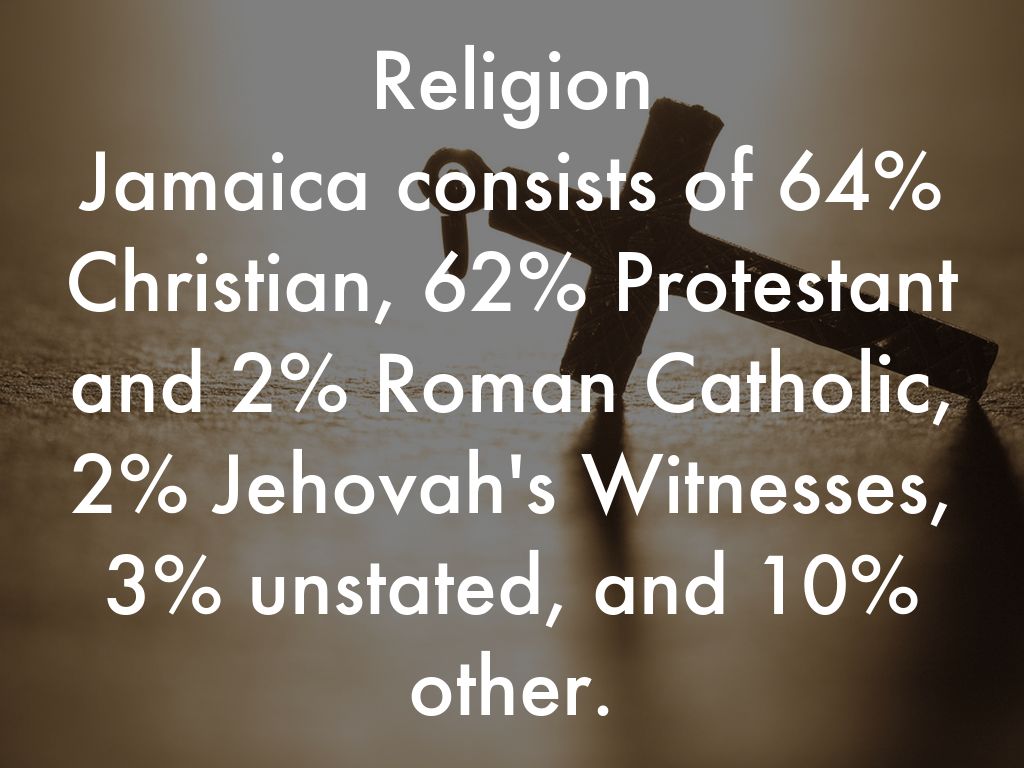 Jamaica consists of 64% Christian, 62% Protestant and 2% Roman Catholic, 2% Jehovah's Witnesses, 3% unstated, and 10% other.