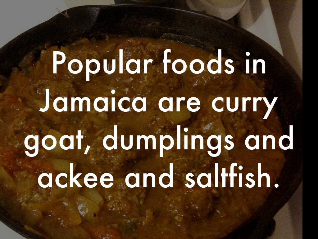 Popular foods in Jamaica are curry goat, dumplings and ackee and saltfish.