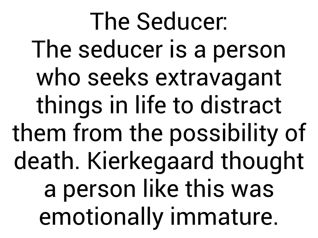 The seducer is a person who seeks extravagant things in life to distract them from the possibility of death. Kierkegaard thought a person like this was emotionally immature.