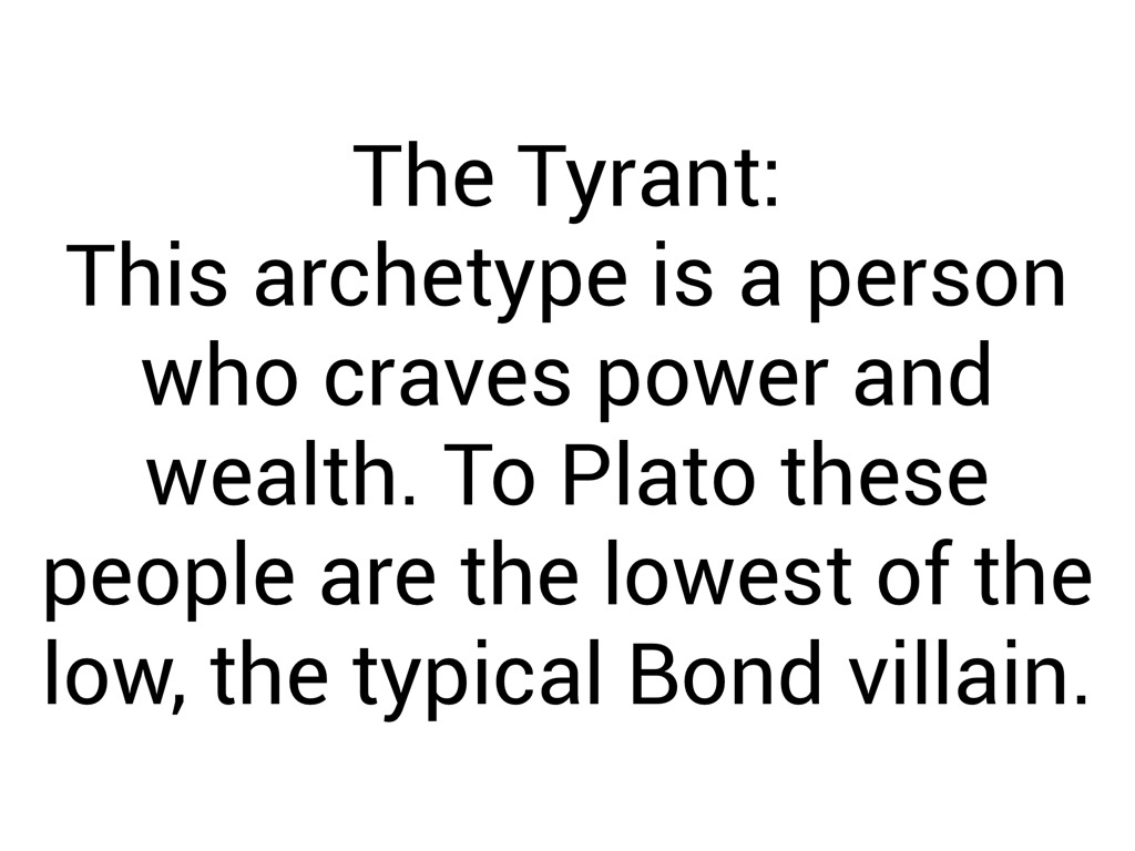 This archetype is a person who craves power and wealth. To Plato these people are the lowest of the low, the typical Bond villain.