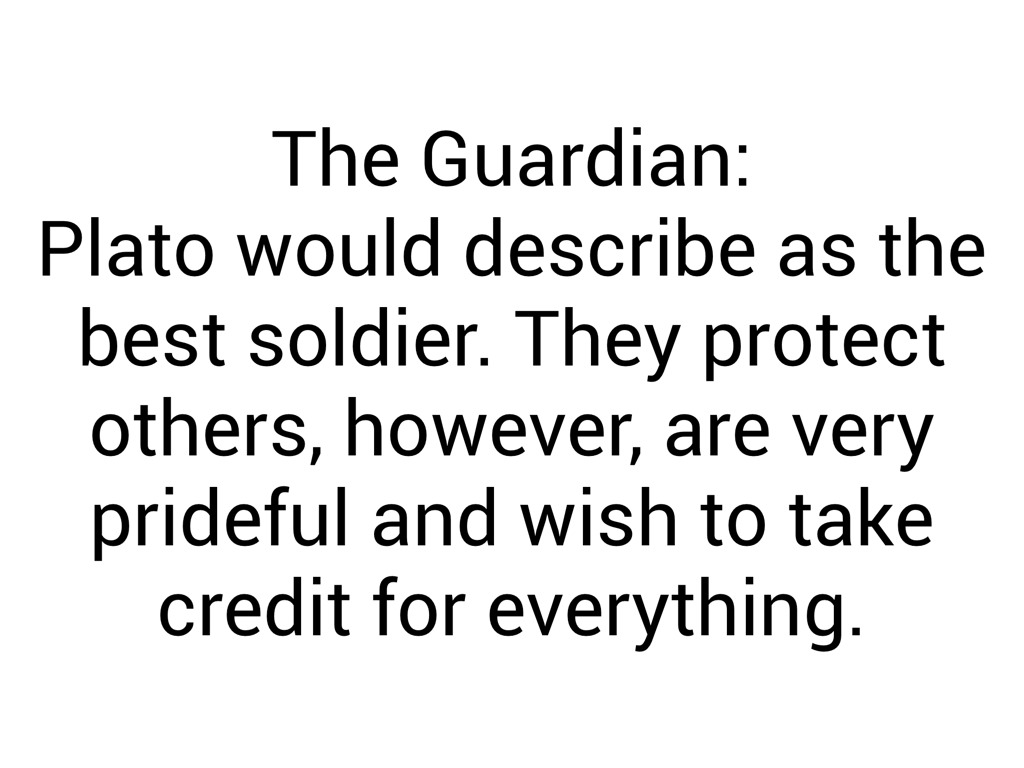 Plato would describe as the best soldier. They protect others, however, are very prideful and wish to take credit for everything.