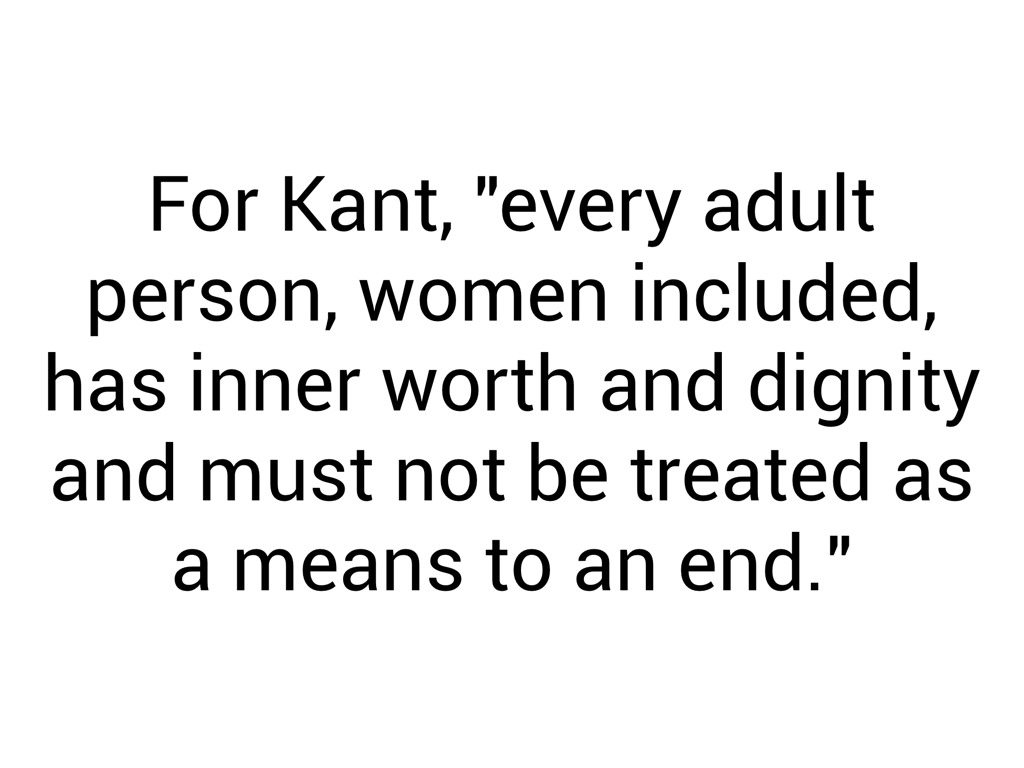 For Kant, "every adult person, women included, has inner worth and dignity and must not be treated as a means to an end."