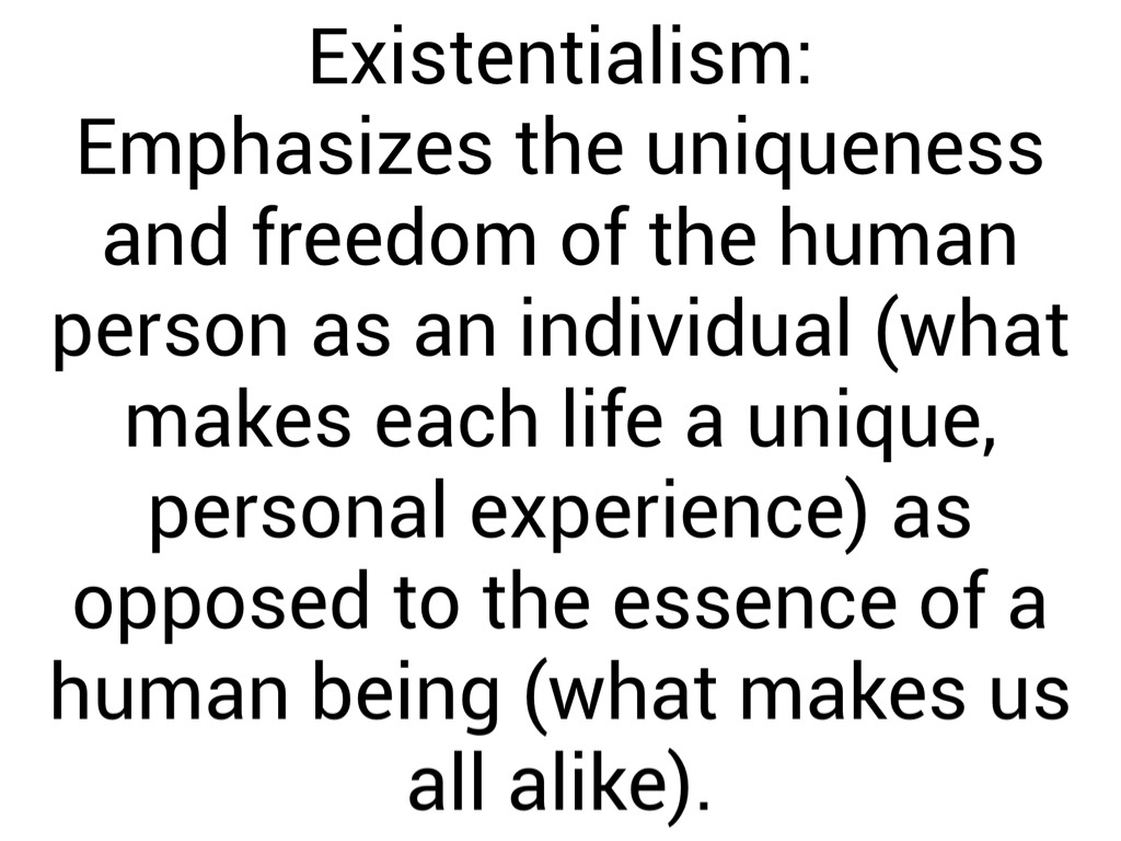 Emphasizes the uniqueness and freedom of the human person as an individual (what makes each life a unique, personal experience) as opposed to the essence of a human being (what makes us all alike).
