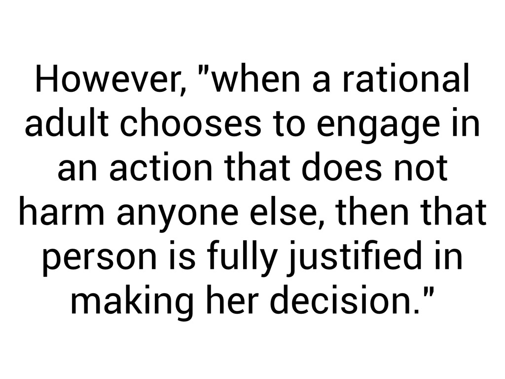 However, "when a rational adult chooses to engage in an action that does not harm anyone else, then that person is fully justified in making her decision."