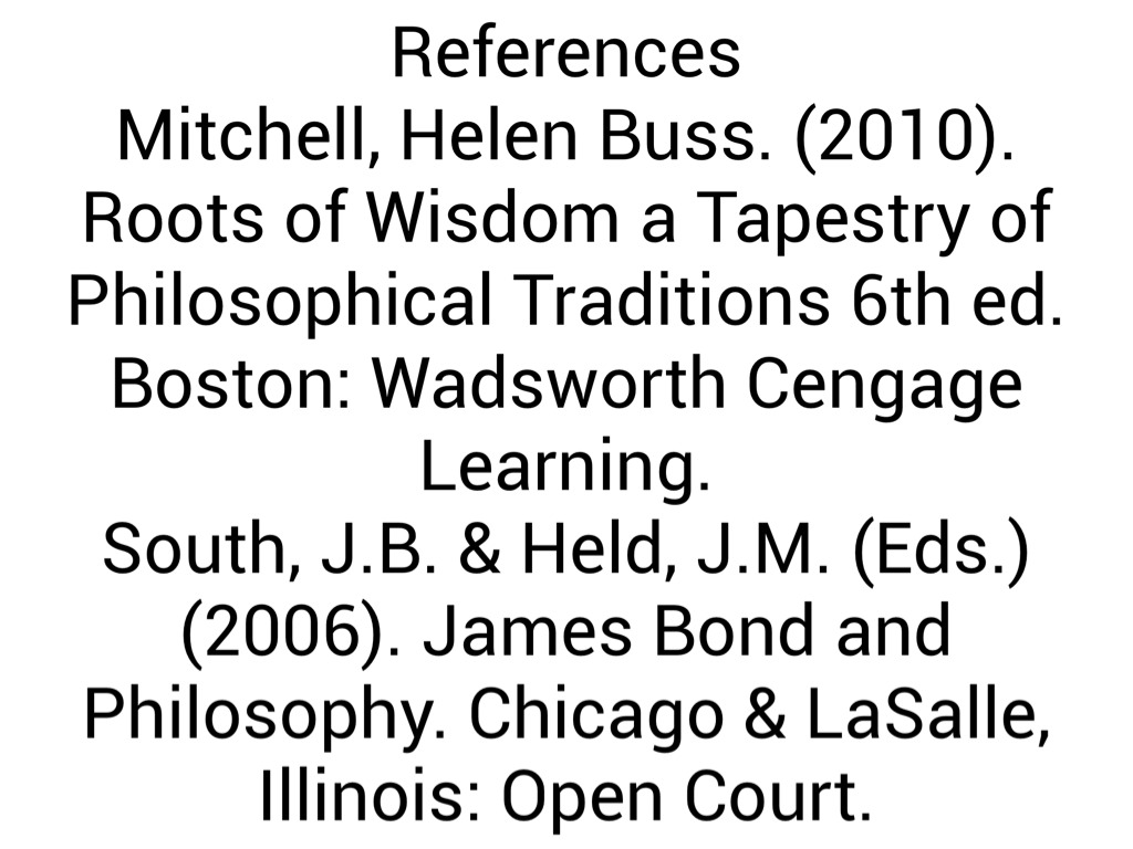 Mitchell, Helen Buss. (2010). Roots of Wisdom a Tapestry of Philosophical Traditions 6th ed. Boston: Wadsworth Cengage Learning.
