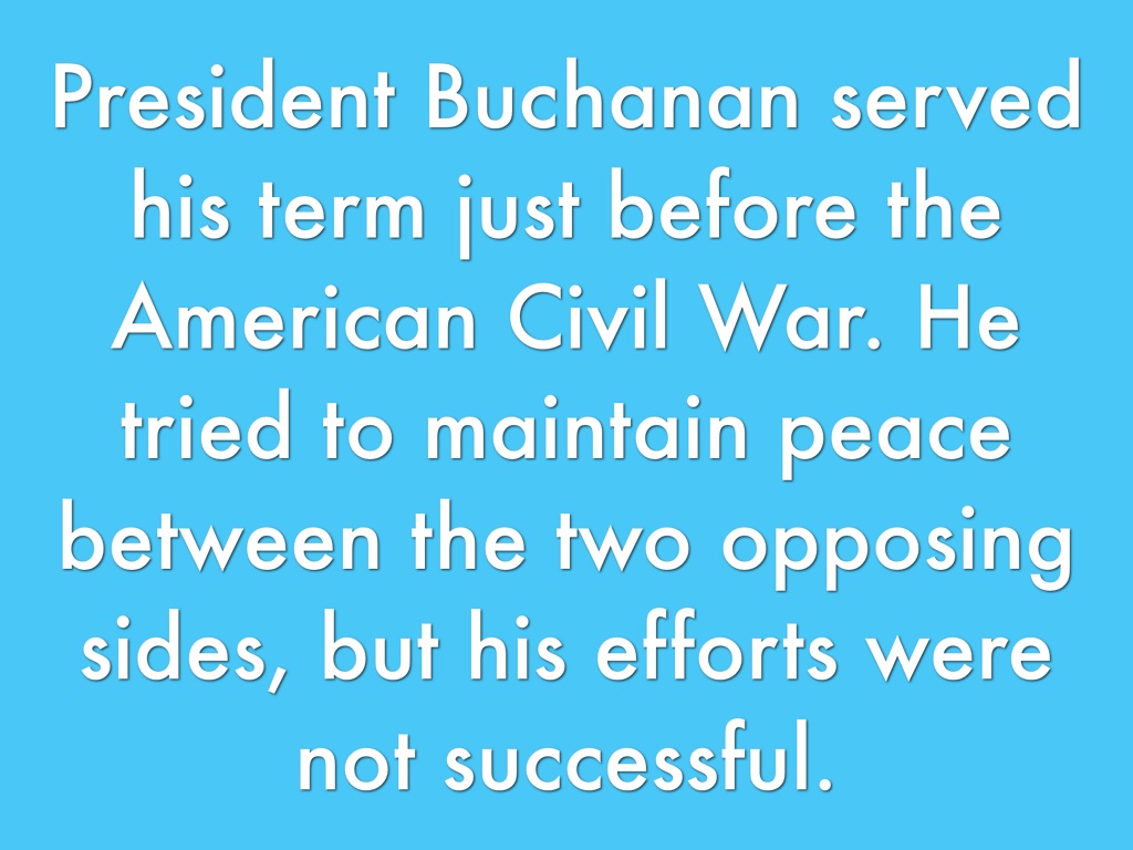 President Buchanan served his term just before the American Civil War. He tried to maintain peace between the two opposing sides, but his efforts were not successful.