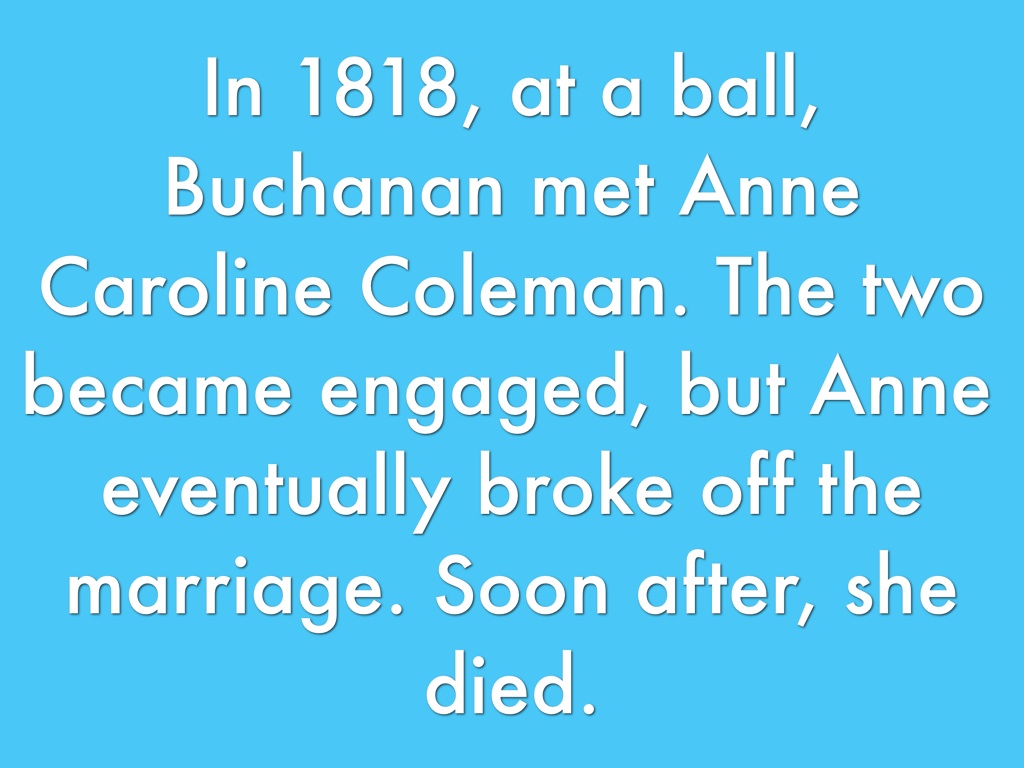 In 1818, at a ball, Buchanan met Anne Caroline Coleman. The two became engaged, but Anne eventually broke off the marriage. Soon after, she died.