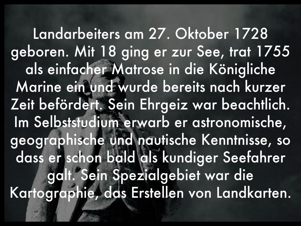 Landarbeiters am 27. Oktober 1728 geboren. Mit 18 ging er zur See, trat 1755 als einfacher Matrose in die Königliche Marine ein und wurde bereits nach kurzer Zeit befördert. Sein Ehrgeiz war beachtlich. Im Selbststudium erwarb er astronomische, geographische und nautische Kenntnisse, so dass er schon bald als kundiger Seefahrer galt. Sein Spezialgebiet war die Kartographie, das Erstellen von Landkarten.