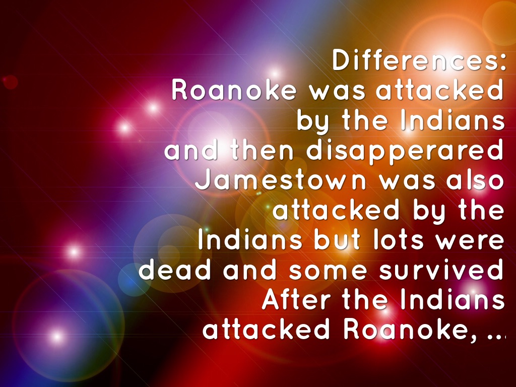 Differences: Roanoke was attacked by the Indians and then disapperared Jamestown was also attacked by the Indians but lots were dead and some survived After the Indians attacked Roanoke, John White didn't find any dead bodies on the ground When Jamestown was attacked, only one skull was left on the ground Unfortuanly, nobody found the skull