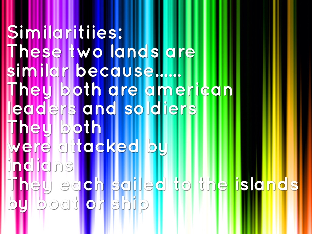 Similaritiies: These two lands are similar because...... They both are american leaders and soldiers They both were attacked by indians They each sailed to the islands by boat or ship