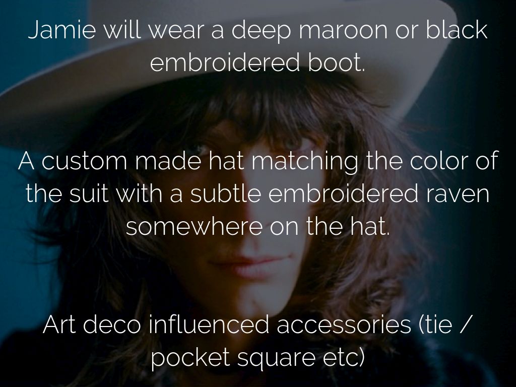 A custom made hat matching the color of the suit with a subtle embroidered raven somewhere on the hat.