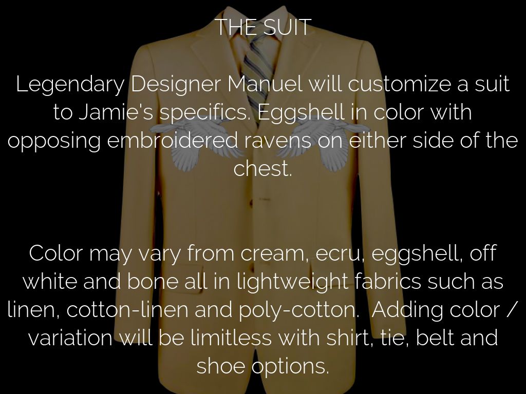 Legendary Designer Manuel will customize a suit to Jamie's specifics. Eggshell in color with opposing embroidered ravens on either side of the chest.