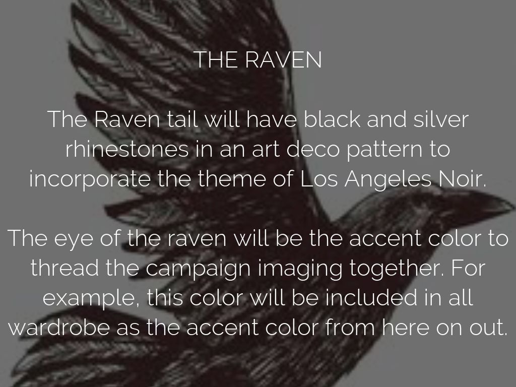The Raven tail will have black and silver rhinestones in an art deco pattern to incorporate the theme of Los Angeles Noir.