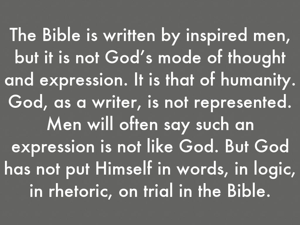 The Bible is written by inspired men, but it is not God’s mode of thought and expression. It is that of humanity. God, as a writer, is not represented. Men will often say such an expression is not like God. But God has not put Himself in words, in logic, in rhetoric, on trial in the Bible.