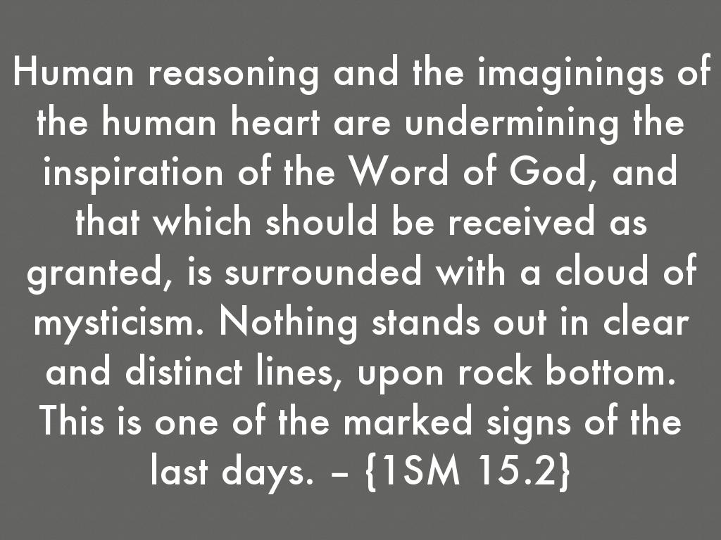 Human reasoning and the imaginings of the human heart are undermining the inspiration of the Word of God, and that which should be received as granted, is surrounded with a cloud of mysticism. Nothing stands out in clear and distinct lines, upon rock bottom. This is one of the marked signs of the last days. – {1SM 15.2}