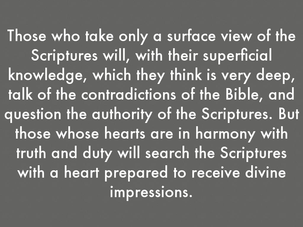 Those who take only a surface view of the Scriptures will, with their superficial knowledge, which they think is very deep, talk of the contradictions of the Bible, and question the authority of the Scriptures. But those whose hearts are in harmony with truth and duty will search the Scriptures with a heart prepared to receive divine impressions.