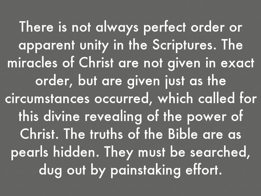There is not always perfect order or apparent unity in the Scriptures. The miracles of Christ are not given in exact order, but are given just as the circumstances occurred, which called for this divine revealing of the power of Christ. The truths of the Bible are as pearls hidden. They must be searched, dug out by painstaking effort.