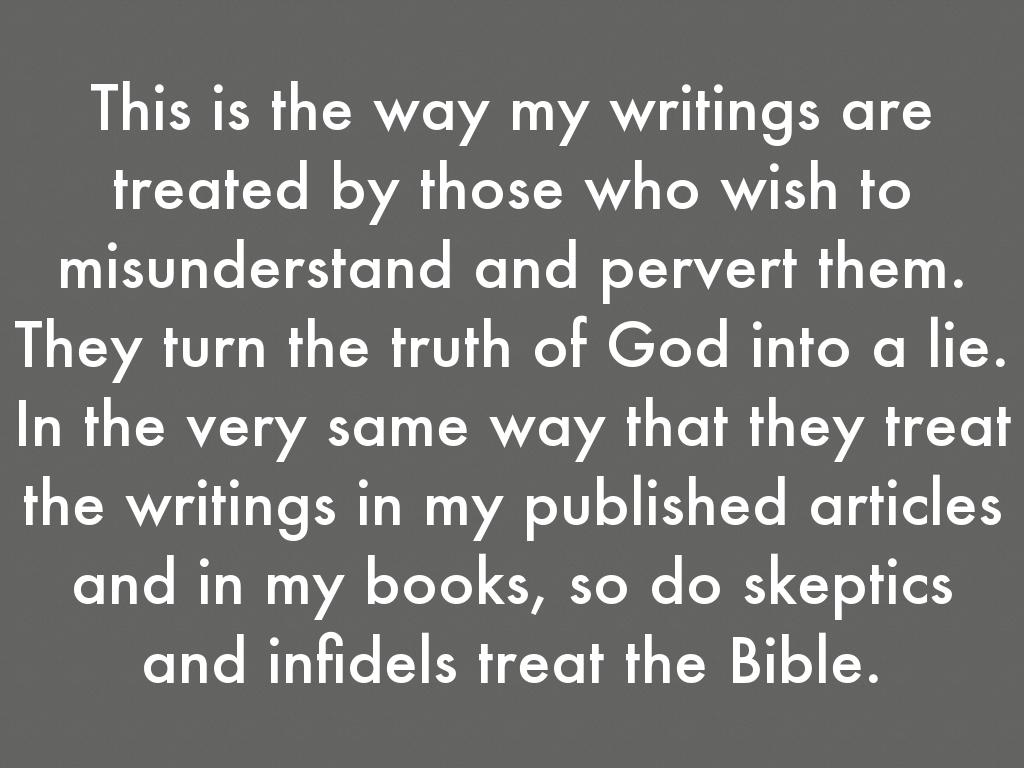 This is the way my writings are treated by those who wish to misunderstand and pervert them. They turn the truth of God into a lie. In the very same way that they treat the writings in my published articles and in my books, so do skeptics and infidels treat the Bible.