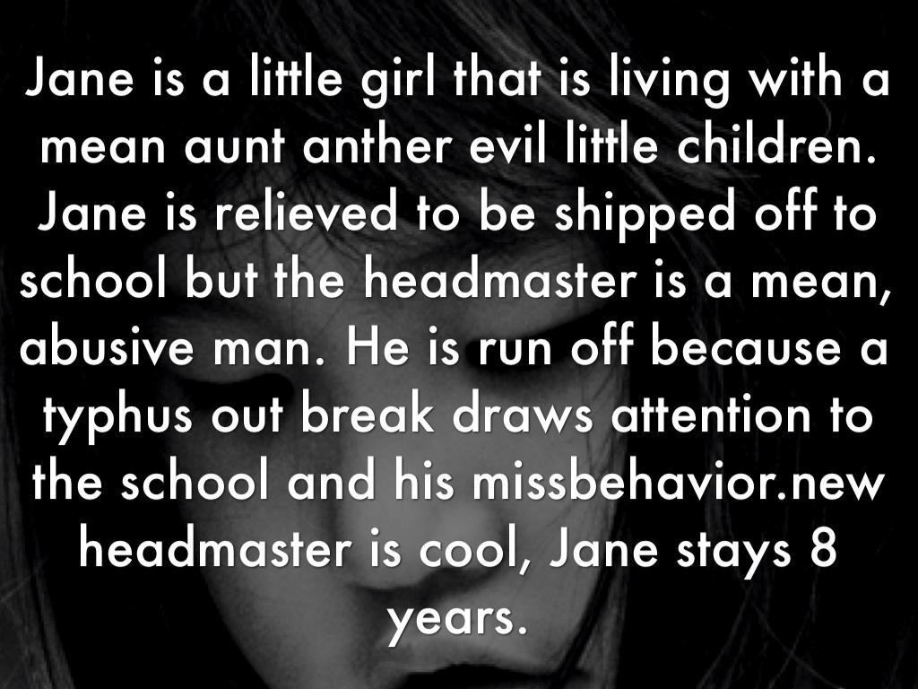 Jane is a little girl that is living with a mean aunt anther evil little children. Jane is relieved to be shipped off to school but the headmaster is a mean, abusive man. He is run off because a typhus out break draws attention to the school and his missbehavior.new headmaster is cool, Jane stays 8 years.