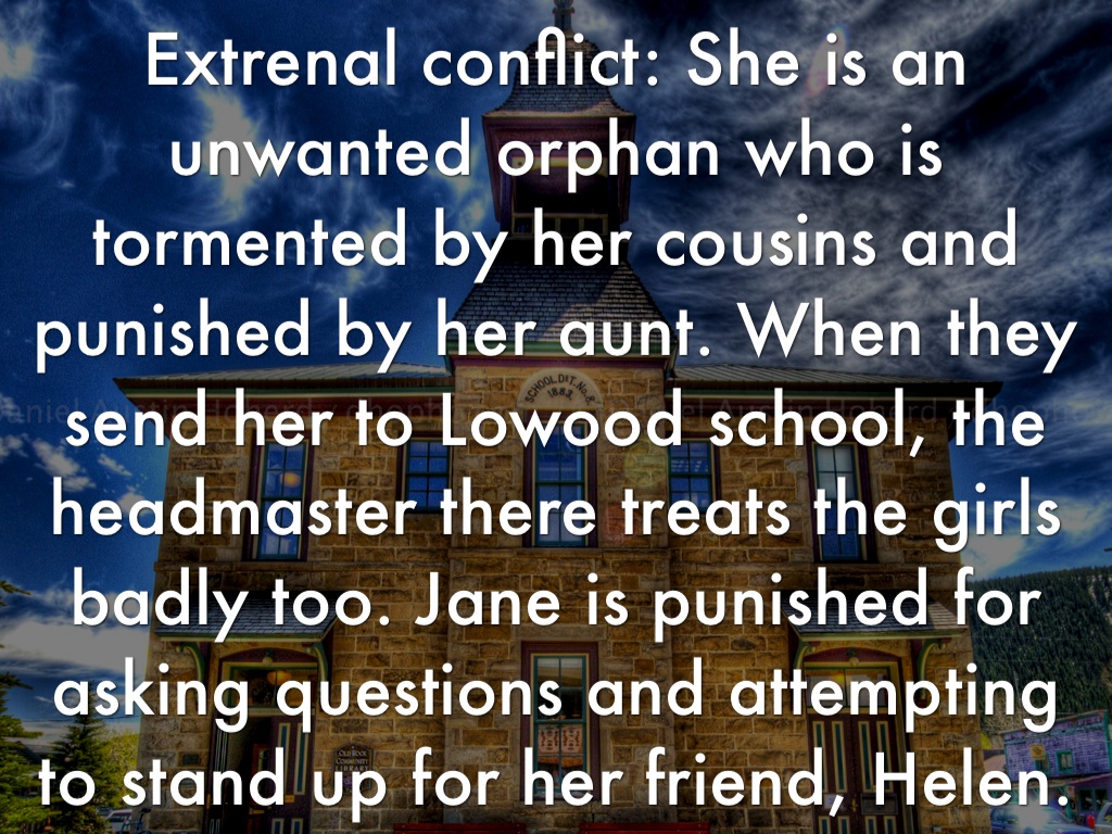 Extrenal conflict: She is an unwanted orphan who is tormented by her cousins and punished by her aunt. When they send her to Lowood school, the headmaster there treats the girls badly too. Jane is punished for asking questions and attempting to stand up for her friend, Helen.