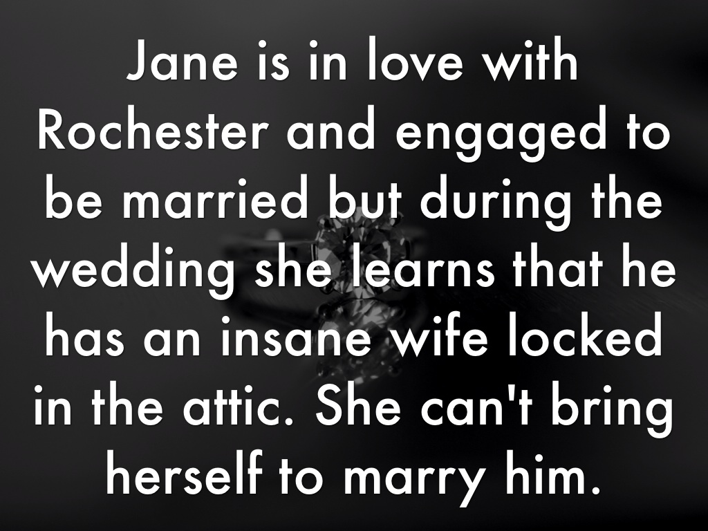 Jane is in love with Rochester and engaged to be married but during the wedding she learns that he has an insane wife locked in the attic. She can't bring herself to marry him.