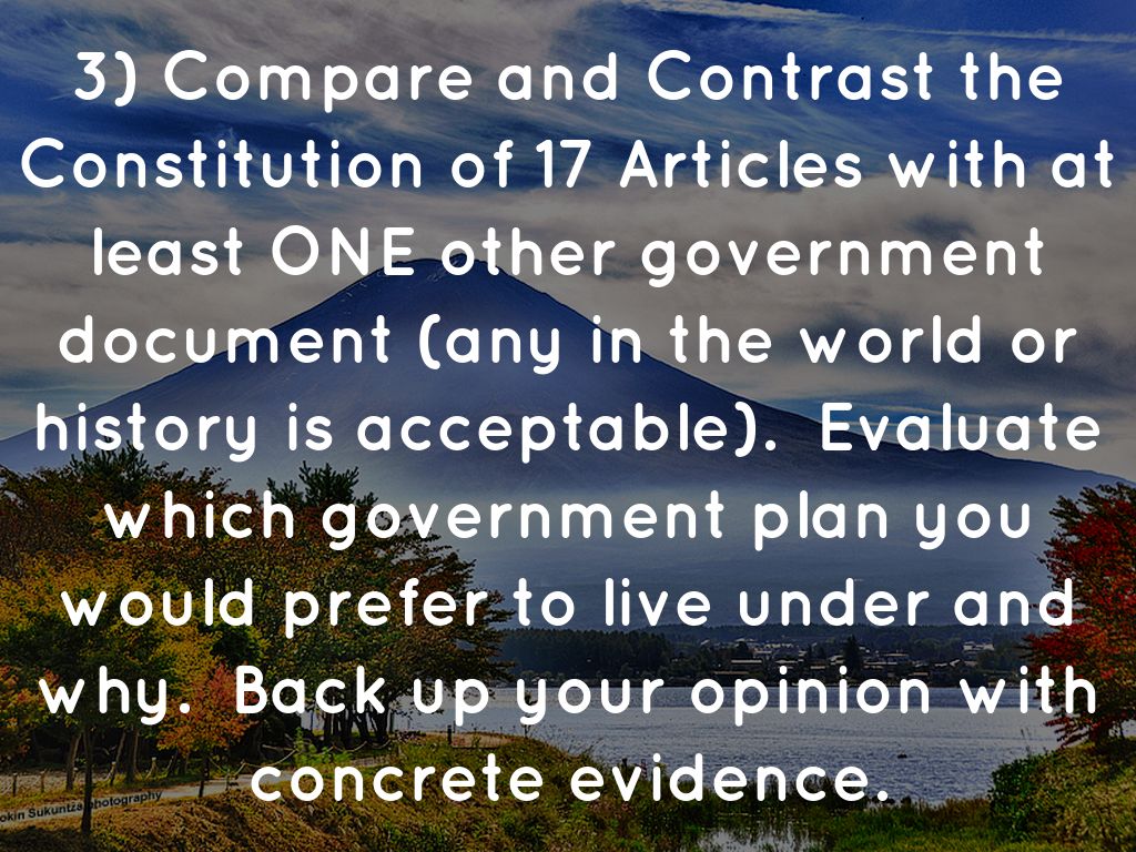 3) Compare and Contrast the Constitution of 17 Articles with at least ONE other government document (any in the world or history is acceptable). Evaluate which government plan you would prefer to live under and why. Back up your opinion with concrete evidence.