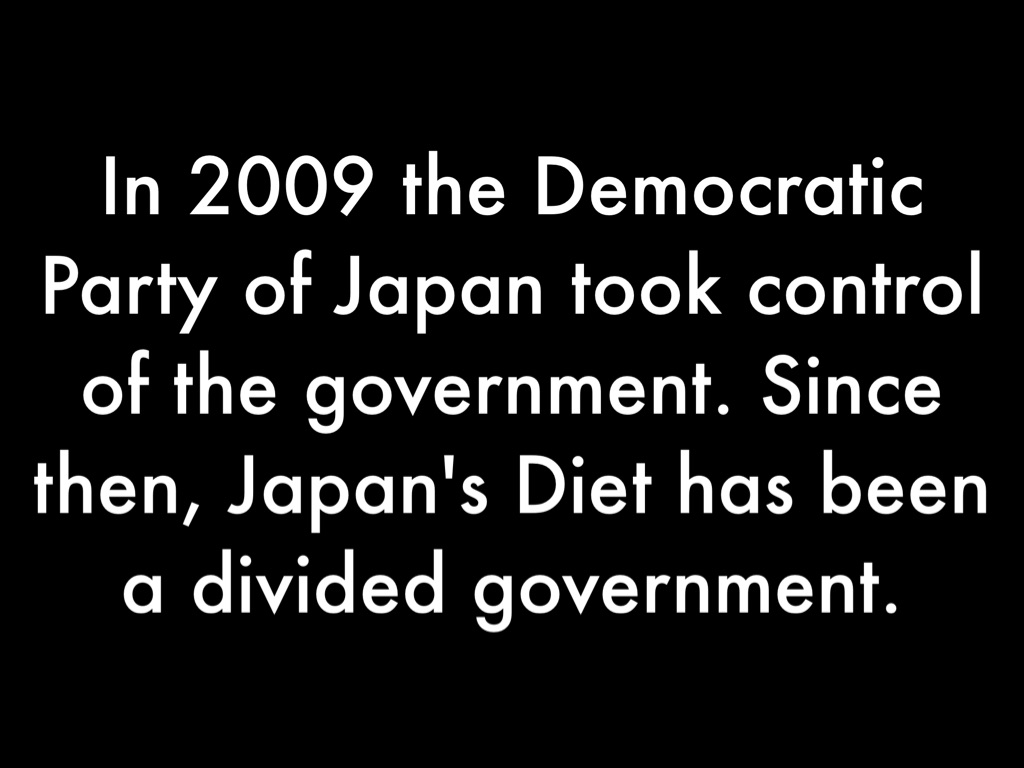 In 2009 the Democratic Party of Japan took control of the government. Since then, Japan's Diet has been a divided government.
