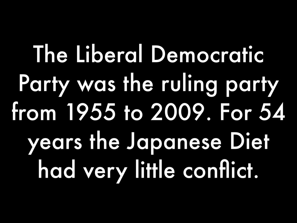 The Liberal Democratic Party was the ruling party from 1955 to 2009. For 54 years the Japanese Diet had very little conflict.
