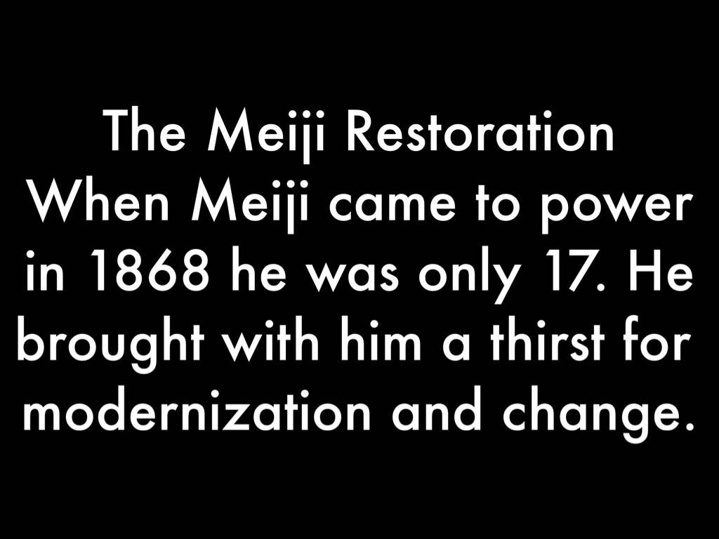 When Meiji came to power in 1868 he was only 17. He brought with him a thirst for modernization and change.