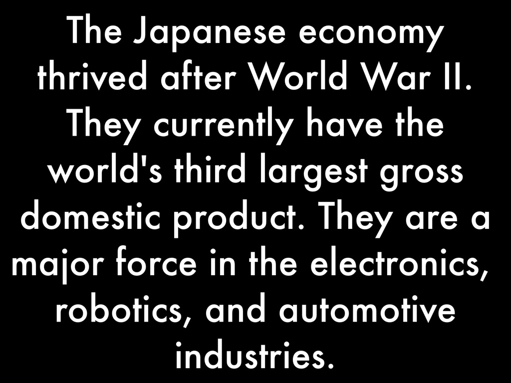 The Japanese economy thrived after World War II. They currently have the world's third largest gross domestic product. They are a major force in the electronics, robotics, and automotive industries.