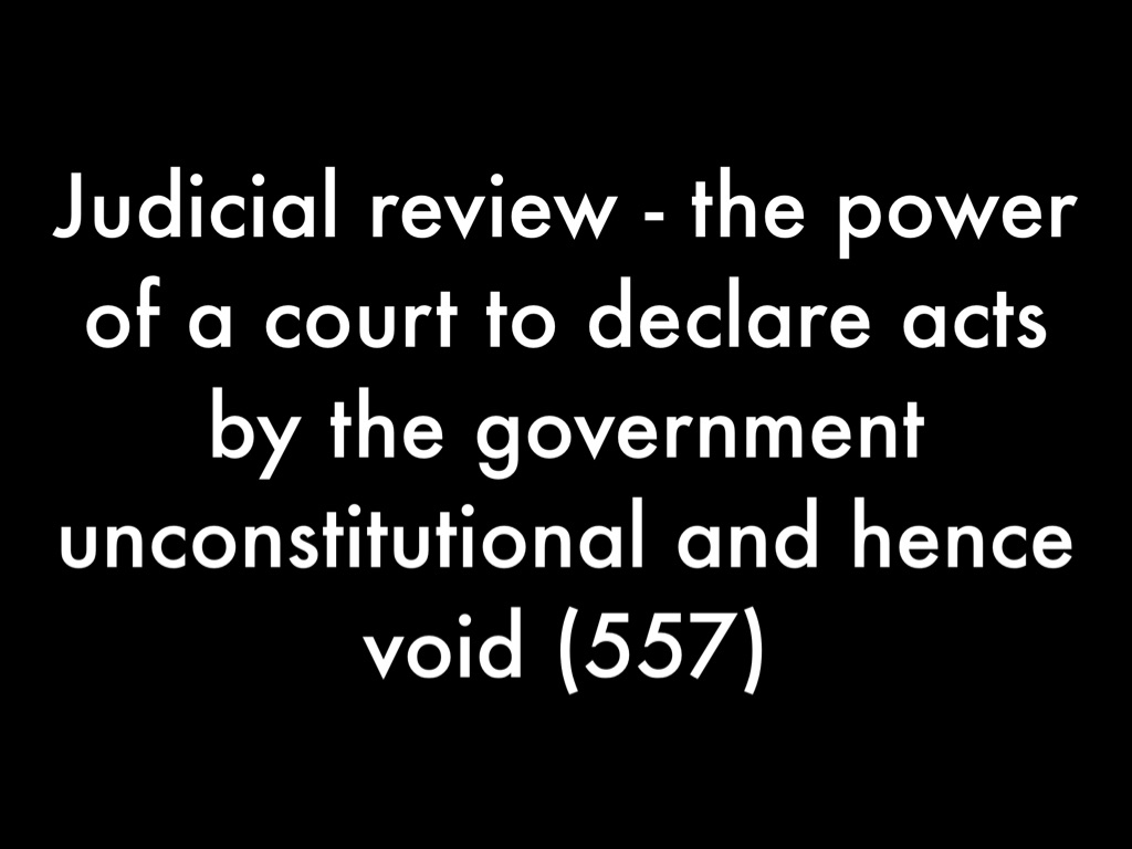 Judicial review - the power of a court to declare acts by the government unconstitutional and hence void (557)