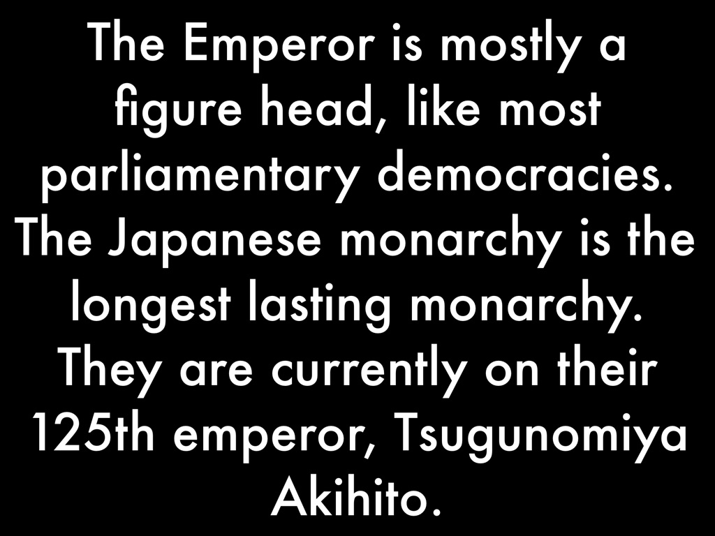 The Emperor is mostly a figure head, like most parliamentary democracies. The Japanese monarchy is the longest lasting monarchy. They are currently on their 125th emperor, Tsugunomiya Akihito.