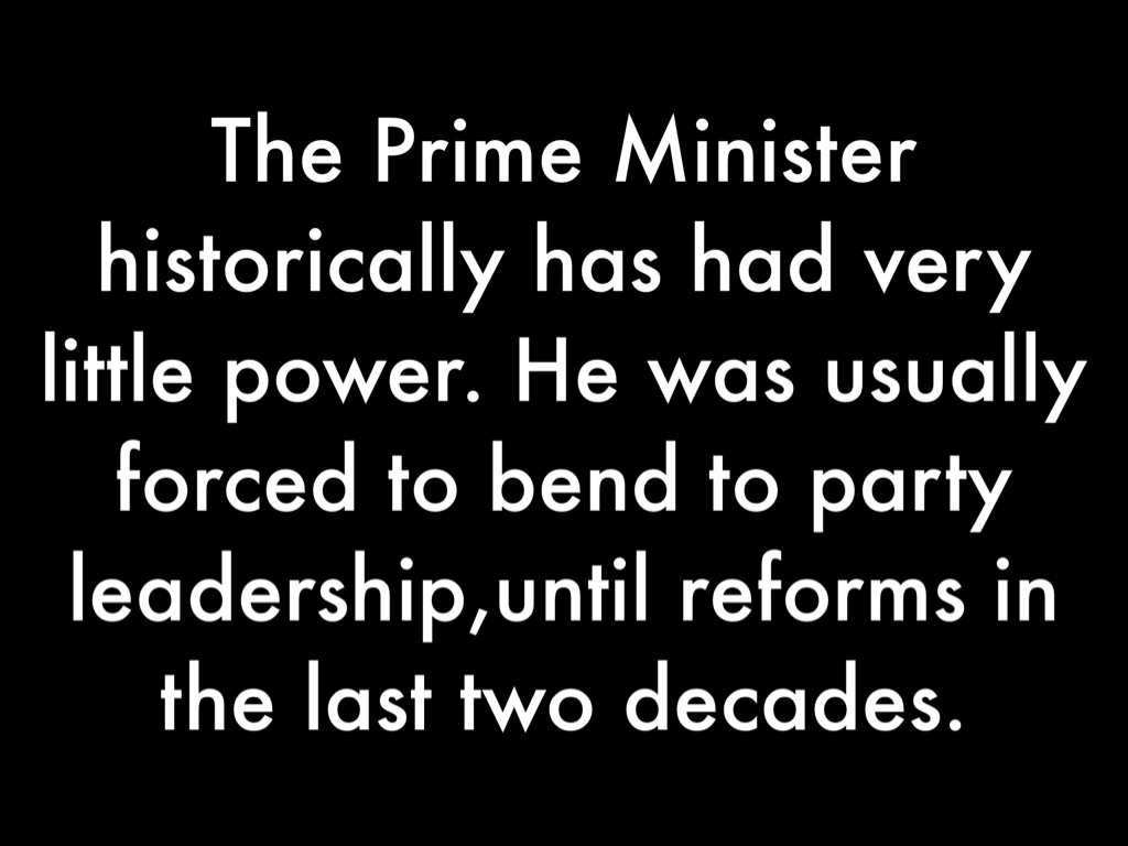The Prime Minister historically has had very little power. He was usually forced to bend to party leadership,until reforms in the last two decades.