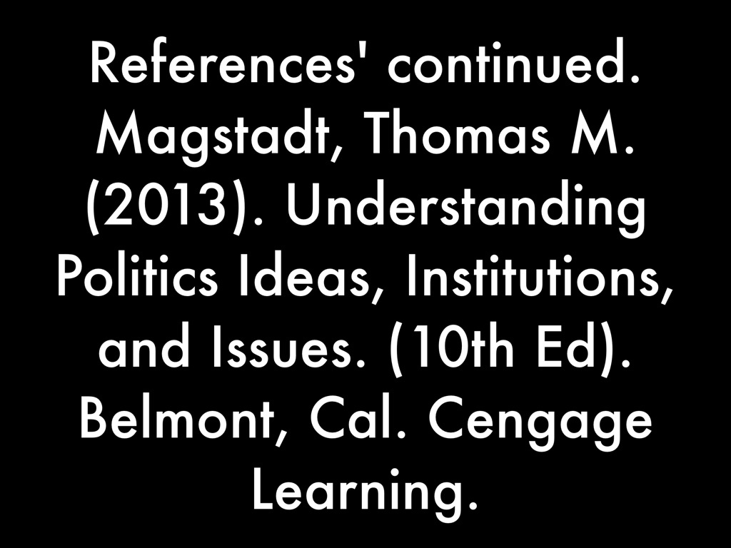 Magstadt, Thomas M. (2013). Understanding Politics Ideas, Institutions, and Issues. (10th Ed). Belmont, Cal. Cengage Learning.