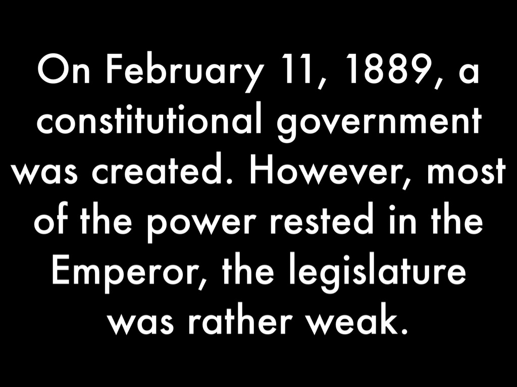 On February 11, 1889, a constitutional government was created. However, most of the power rested in the Emperor, the legislature was rather weak.