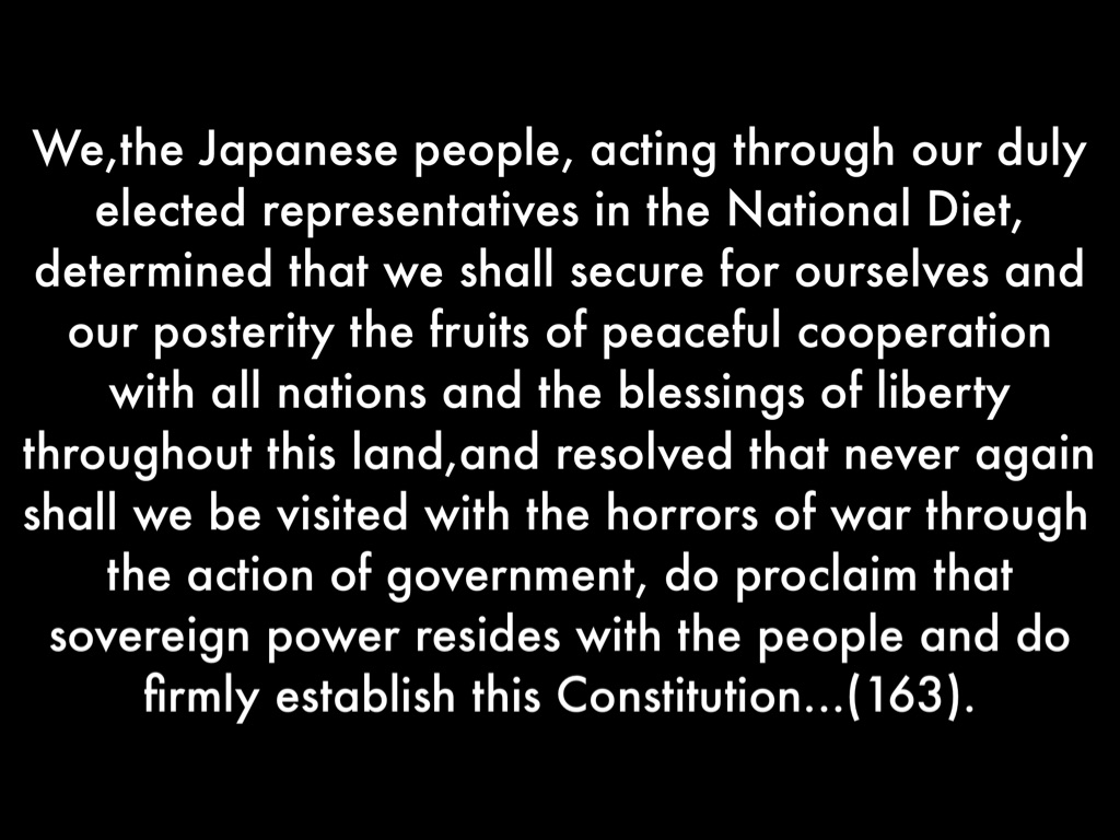 We,the Japanese people, acting through our duly elected representatives in the National Diet, determined that we shall secure for ourselves and our posterity the fruits of peaceful cooperation with all nations and the blessings of liberty throughout this land,and resolved that never again shall we be visited with the horrors of war through the action of government, do proclaim that sovereign power resides with the people and do firmly establish this Constitution...(163).