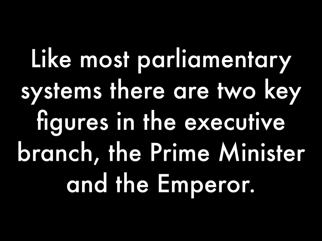 Like most parliamentary systems there are two key figures in the executive branch, the Prime Minister and the Emperor.
