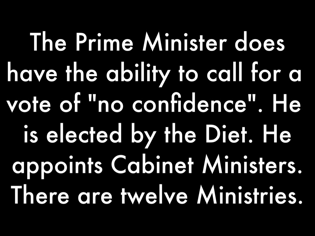 The Prime Minister does have the ability to call for a vote of "no confidence". He is elected by the Diet. He appoints Cabinet Ministers. There are twelve Ministries.
