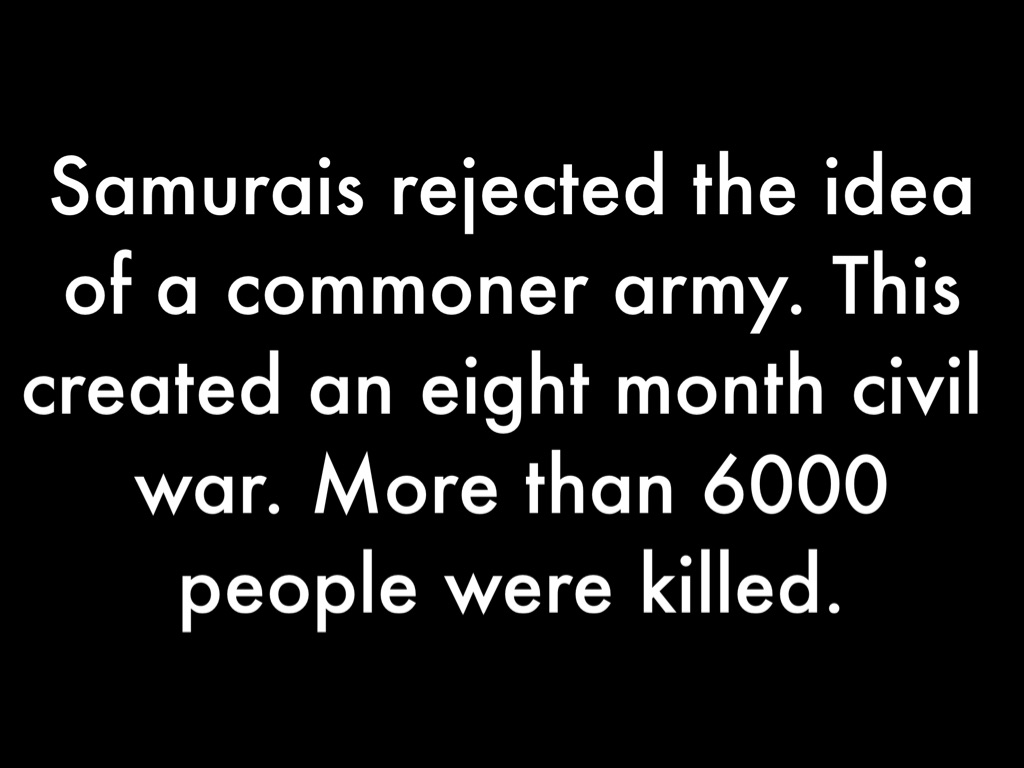 Samurais rejected the idea of a commoner army. This created an eight month civil war. More than 6000 people were killed.