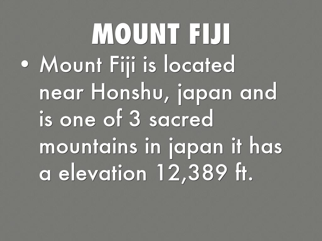 Mount Fiji is located near Honshu, japan and is one of 3 sacred mountains in japan it has a elevation 12,389 ft.