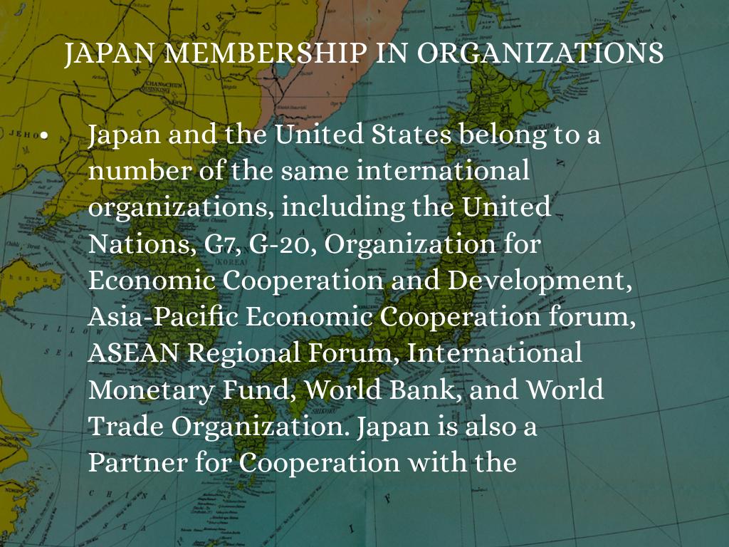 Japan and the United States belong to a number of the same international organizations, including the United Nations, G7, G-20, Organization for Economic Cooperation and Development, Asia-Pacific Economic Cooperation forum, ASEAN Regional Forum, International Monetary Fund, World Bank, and World Trade Organization. Japan is also a Partner for Cooperation with the Organization for Security and Cooperation in Europe and an observer to the Organization of American States.