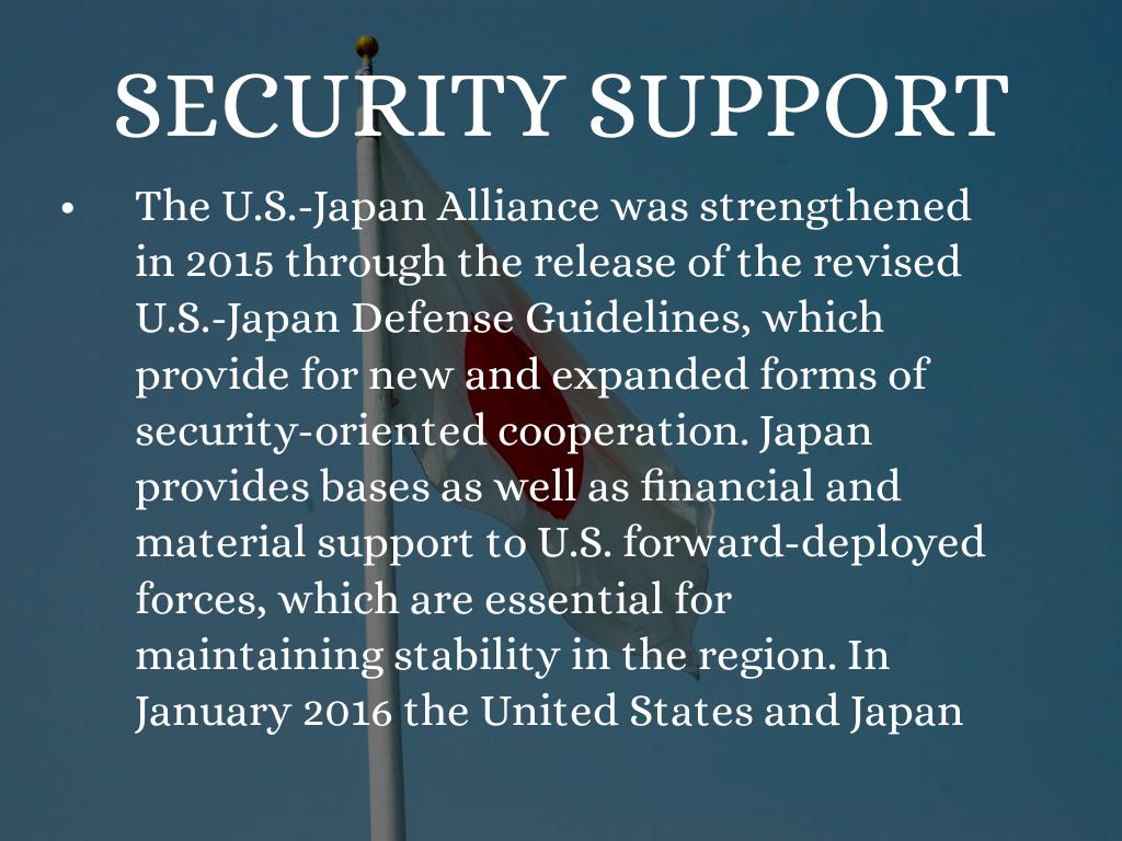 The U.S.-Japan Alliance was strengthened in 2015 through the release of the revised U.S.-Japan Defense Guidelines, which provide for new and expanded forms of security-oriented cooperation. Japan provides bases as well as financial and material support to U.S. forward-deployed forces, which are essential for maintaining stability in the region. In January 2016 the United States and Japan signed a new five-year package of host nation support for U.S. forces in Japan.