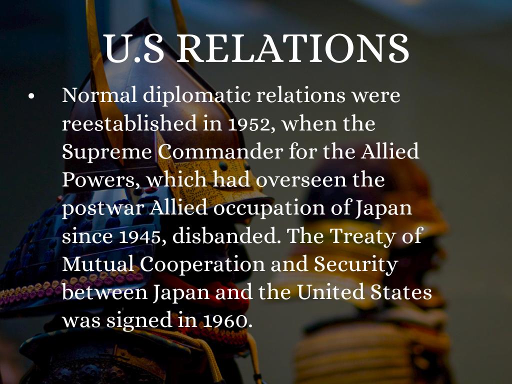 Normal diplomatic relations were reestablished in 1952, when the Supreme Commander for the Allied Powers, which had overseen the postwar Allied occupation of Japan since 1945, disbanded. The Treaty of Mutual Cooperation and Security between Japan and the United States was signed in 1960.