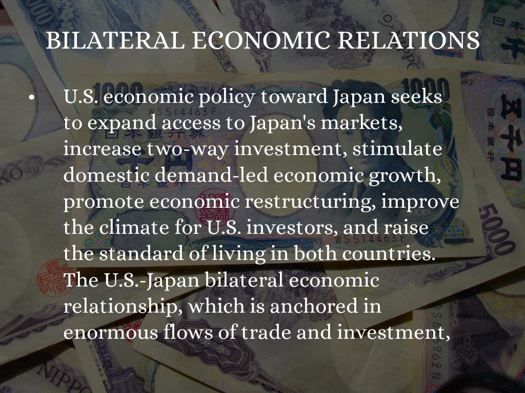 U.S. economic policy toward Japan seeks to expand access to Japan's markets, increase two-way investment, stimulate domestic demand-led economic growth, promote economic restructuring, improve the climate for U.S. investors, and raise the standard of living in both countries. The U.S.-Japan bilateral economic relationship, which is anchored in enormous flows of trade and investment, is strong, mature, and increasingly interdependent.