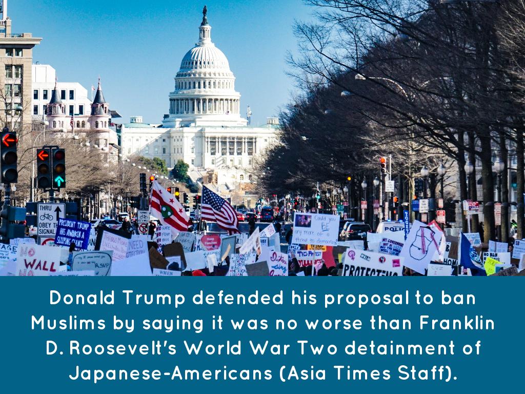 Donald Trump defended his proposal to ban Muslims by saying it was no worse than Franklin D. Roosevelt's World War Two detainment of Japanese-Americans (Asia Times Staff).